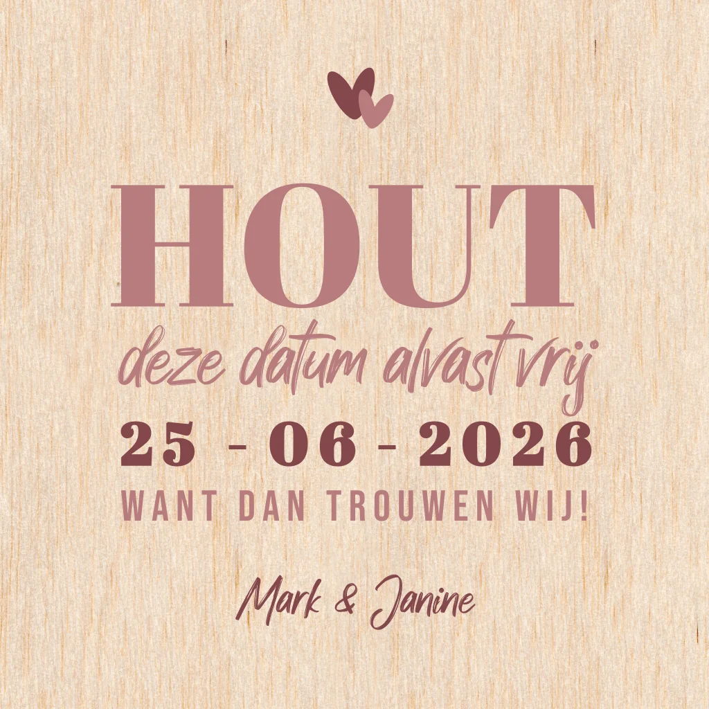 Maak jullie aankondiging onvergetelijk met onze bijzondere houten Save the Date kaart, compleet met een speels woordgrapje: "Hout deze datum vrij." Deze kaart straalt warmte en originaliteit uit, precies zoals jullie liefde.