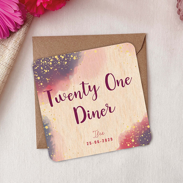 Maak indruk met deze originele houten uitnodiging voor jouw 21-diner. De combinatie van waterverf en goudkleurige verfspetters geeft de kaart een trendy en luxe uitstraling. Gemaakt van echt hout, wat zorgt voor een unieke en stijlvolle touch. Personaliseer de uitnodiging eenvoudig en bestel een proefdruk om de kwaliteit zelf te ervaren. Perfect voor een bijzonder en onvergetelijk 21-diner.