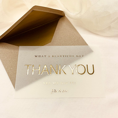Vier jullie liefde met onze doorschijnende bedankkaart, gemaakt van prachtig kalkpapier en verfraaid met glinsterend goudfolie. Het minimalistische ontwerp straalt een tijdloze elegantie uit, perfect voor het delen van dankbaarheid na jullie speciale dag. Volledig aanpasbaar naar jullie wensen, biedt deze kaart de mogelijkheid om jullie eigen tekst toe te voegen. Bestel een proefdruk om het subtiele design te ervaren en pas indien nodig aan voordat de definitieve bestelling wordt geplaatst. Kies ook een mooie envelop die bij jullie stijl past, en creëer een blijvende herinnering aan jullie trouwdag met deze unieke en stijlvolle bedankkaart.