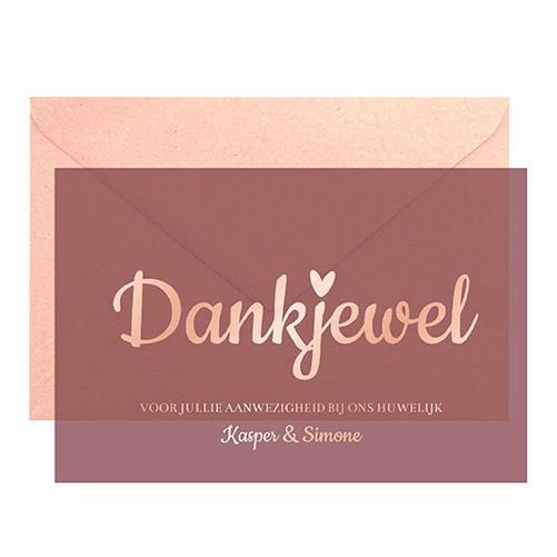 Laat jullie liefde schitteren met onze stijlvolle bedankkaart met een pumkleurige achtergrond, vervaardigd van subtiel kalkpapier met en verfraaid met rosé-goufoliefolie. Deze kaart is volledig aanpasbaar naar jullie wensen, biedt deze kaart de mogelijkheid om jullie eigen tekst toe te voegen. Bestel een proefdruk om het ontwerp goed te kunnen bekijken en pas indien nodig aan voordat de definitieve bestelling wordt geplaatst. Maak de ervaring compleet door een mooie envelop te kiezen die perfect past bij jullie stijl. Creëer een blijvende herinnering aan jullie trouwdag met deze unieke en liefdevolle bedankkaart.