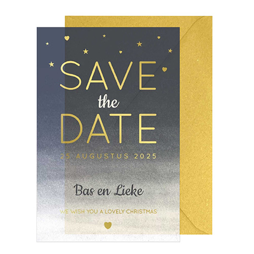Kondig jullie trouwdatum aan tijdens de feestdagen met deze stijlvolle Kerst Save the Date kaart van kalkpapier. De diepblauwe tint en subtiele goudfolie voegen glamour toe aan de feestelijke sterren, terwijl het licht doorschijnende kalkpapier voor een elegante touch zorgt. Voeg jullie datum en een persoonlijke kerstwens toe voor een unieke kaart die volledig aan te passen is. Bestel een proefdruk en maak het compleet met een mooie envelop uit ons assortiment. Een perfecte mix van kerstsfeer en trouwdatum die jullie gasten zal betoveren.