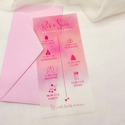 Voeg een vleugje magie toe aan jullie speciale dag met ons "Dromerig Dagprogramma" gedrukt op kalkpapier. De lichtroze tinten, aangevuld met zachte witte hartjes en een vleugje geel, creëren een betoverende sfeer. De elegante details van het dagprogramma worden op unieke wijze weergegeven op het licht doorschijnende kalkpapier, waardoor een dromerig effect ontstaat.