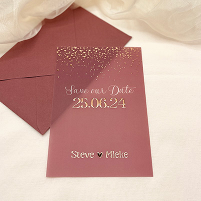 Laat familie en vrienden op tijd weten wanneer jullie gaan trouwen met deze elegante Save the Date-kaart. De kaart heeft een prachtige roze achtergrond en een glinsterende roze goudfolie hartjes op kalkpapier. De witte tekst is subtiel en verfijnd, afgestemd op de natuurlijke tint van het kalkpapier. Als kers op de taart kun je zelfs een proefdruk bestellen om de perfecte aankondiging te garanderen. Personaliseer je aankondiging verder door een prachtige envelop te kiezen uit onze exclusieve collectie, zodat jouw Save the Date-kaart echt opvalt.