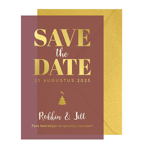 Save the date kerstkaart met goudfolie en plumkleurig kalkpapier