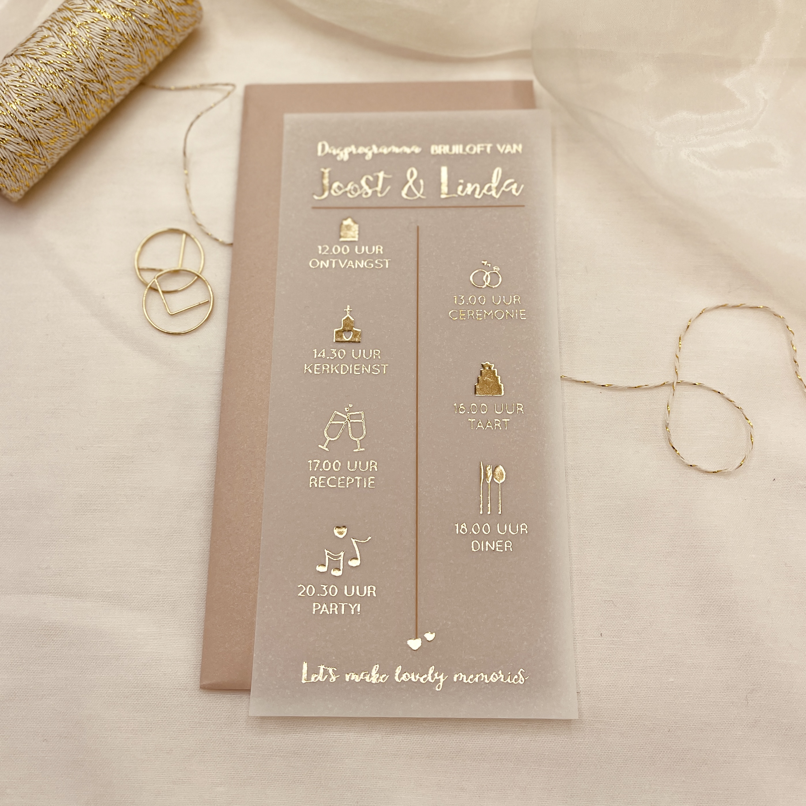 Stijlvolle dagprogramma kaart voor jullie huwelijk van kalkpapier bedrukt met goudfolie.