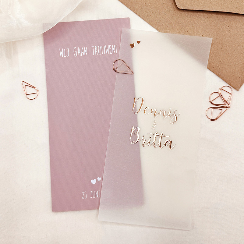 Elegante trouwkaart met kalkpapier en goudfolie hartjes – Romantische en luxe uitstraling