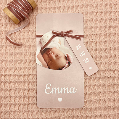 Ontwerp het perfecte geboortekaartje voor jullie dochter met ons trendy label geboortekaartje met een zachte oudroze achtergrond. Deze kaart bestaat uit drie labels: een achterkaart en een label met de geboortedatum en een hartvormig label waarop je een schattige foto van jullie kleintje kunt plaatsen. Maak het helemaal af door de labeltjes aan de achterkaart te bevestigen met een stijlvol lintje, touwtje of koordje.