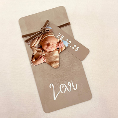 Het langwerpige kaartje heeft een prachtige structuur in beige met witte tinten. Het sterrenlabel biedt ruimte voor een foto van jullie kleintje, terwijl het andere label de geboortedatum vermeldt.