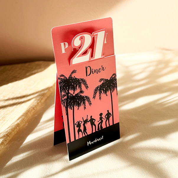 Deze originele menukaart bestaat uit twee losse kaarten die je eenvoudig in elkaar schuift. Hierdoor blijft de kaart rechtop staan in de vorm van een tentje, met het cijfer 21 bovenin uitgestanst voor een speels effect. Een unieke en stijlvolle blikvanger die je nergens anders ziet.