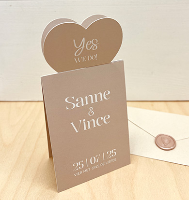 Met deze bijzondere label trouwkaart met een minimalistisch ontwerp maak je zeker indruk op je gasten! Deze beige trouwkaart bestaat uit twee delen die je in elkaar kunt schuiven. Aan de bovenkant van de kaart zitten hartjes met daar onder een gleuf om de kaarten in elkaar te schuiven. Super leuk natuurlijk, zo kunnen de genodigden jullie kaart op een mooi plekje neerzetten. Je kunt de kaart naar wens aanpassen en een proefdruk bestellen om jullie huwelijks uitnodiging in het echt te kunnen beoordelen. Zo weet je zeker dat alles precies zo is zoals jullie dat willen. De kaart is uniek en echt een aanrader voor bruidsparen die op zoek zijn naar iets origineels!