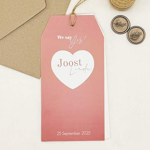 Maak jullie huwelijksuitnodiging extra bijzonder met deze originele labelkaart met hartvormige uitsnede. De trouwkaart bestaat uit twee losse labels van ongeveer 10x21 cm, die je eenvoudig met een lintje of touwtje aan elkaar kunt bevestigen. Dit zorgt voor een speelse en stijlvolle uitstraling. Het bevestigingsmateriaal wordt niet standaard meegeleverd, zodat je zelf een lint of touw kunt kiezen dat perfect past bij jullie bruiloftsstijl. Personaliseer de kaart naar wens en bestel een proefdruk om het ontwerp tot in detail af te stemmen op jullie speciale dag.