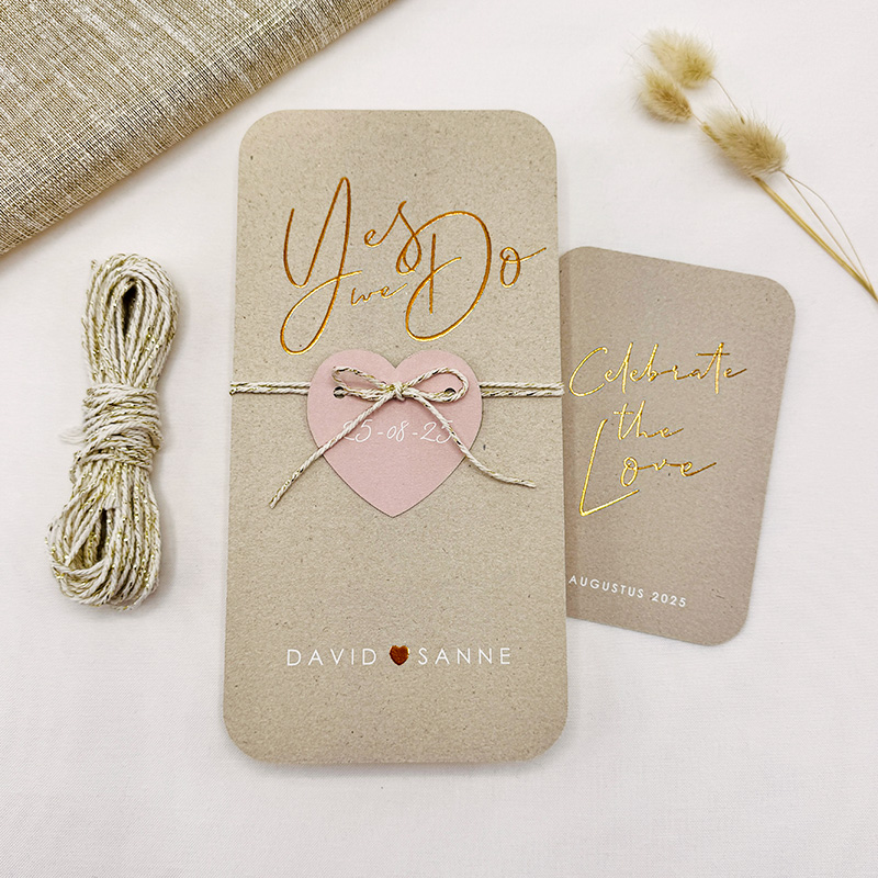 De kaart is uitgevoerd in een stijlvolle kraftlook, waardoor hij een rustieke en warme sfeer creëert. De goudfolie bedrukking voegt een vleugje glamour toe aan het geheel, waardoor jouw trouwkaart echt opvalt.