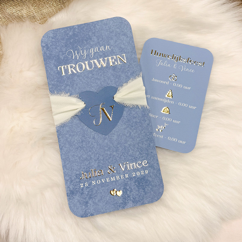 Trouwkaart met dagprogramma en hartvormig label blauwtinten goudfolie
