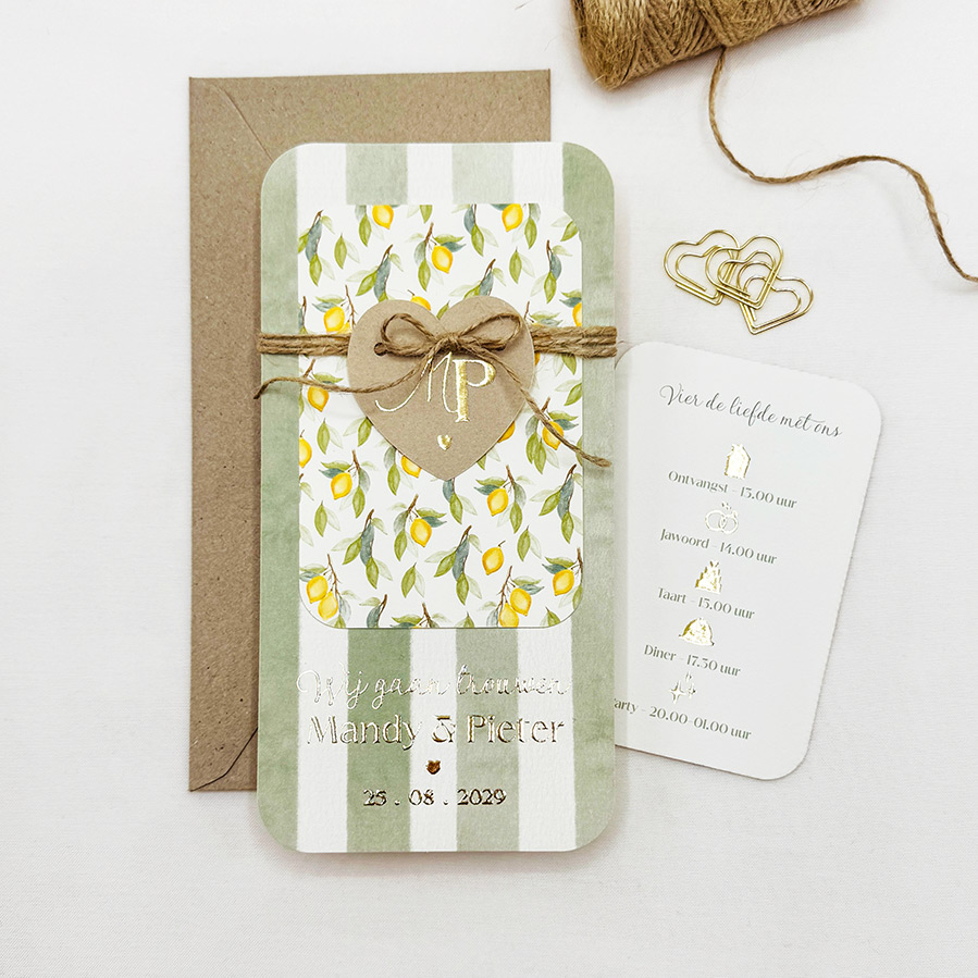 Een unieke trouwkaartenset in labelvorm perfect voor een zomerse bruiloft! Deze stijlvolle trouwkaart bestaat uit drie kaarten: een langwerpige hoofdkaart met afgeronde hoeken en een elegant patroon van olijfgroen en crèmekleurige waterverf strepen, bedrukt met luxe goudfolie. Daarbij een kraft-kleurig hartjeslabel met jullie persoonlijke monogram, eenvoudig zelf te bevestigen met lint of touw. Het derde kaartje heeft een fris patroon van citroentakjes, blaadjes en citroenen – ideaal voor een bruiloft met een Italiaans of mediterraan tintje. Op de achterkant staat een overzichtelijk dagprogramma met trouw-icoontjes. Pas de kaart naar wens aan, bestel een proefdruk en word verliefd op jullie trouwkaart!