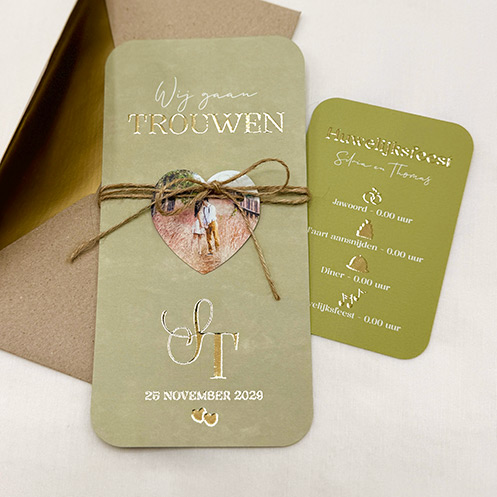 Trouwkaart olijfgroen met hartvormig fotolabel - Olive and Gold