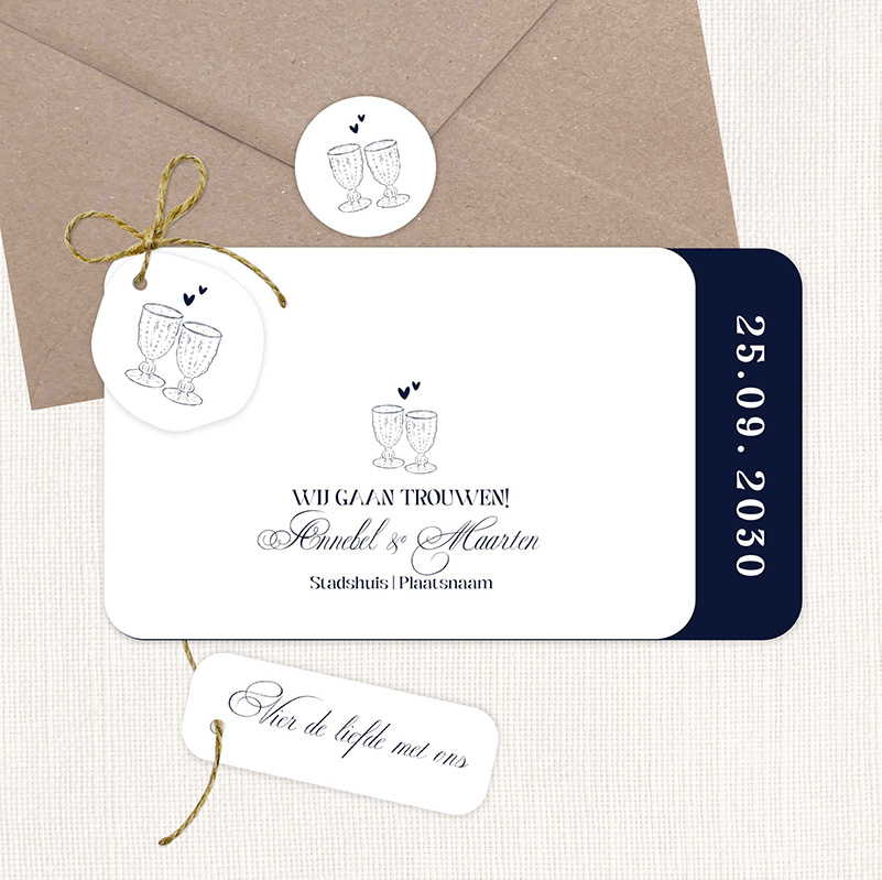 Deze stijlvolle trouwkaart in labelvorm bestaat uit meerdere kaartjes die samen een elegant geheel vormen. De combinatie van diepblauw en wit, met een handgetekende illustratie van glazen, geeft de set een klassieke en toch moderne uitstraling.
