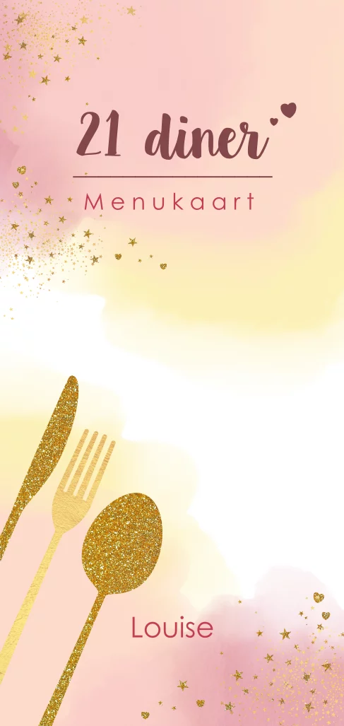 Hippe en trendy menukaart voor een 21 diner. Pastel waterverf, goudkleurig bestek en sterren. (geen echte glitters of goudfolie) Pas de kaart naar wens aan en maak er jouw persoonlijke uitnodiging van Nodig je vriendinnen uit met de passende uitnodiging. HUISSTIJL: zomerse pasteltinten watercolor.