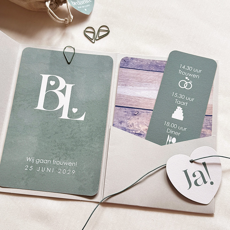 Vier jullie liefde met onze stijlvolle trouwkaarten set in natuurlijke tinten! Deze set, ideaal voor in een pocketfold mapje of om als stapelkaart te verzenden, bestaat uit drie grotere kaarten en een charmant hartjes labeltje. Bevestig het labeltje met een lint of touwtje voor een natuurlijke uitstraling. Het ontwerp combineert prachtige groene en beige tinten, met één kaart voorzien van een elegante houtprint. Deze rustieke en natuurlijke stijl geeft een warme en uitnodigende sfeer aan jullie uitnodigingen.
