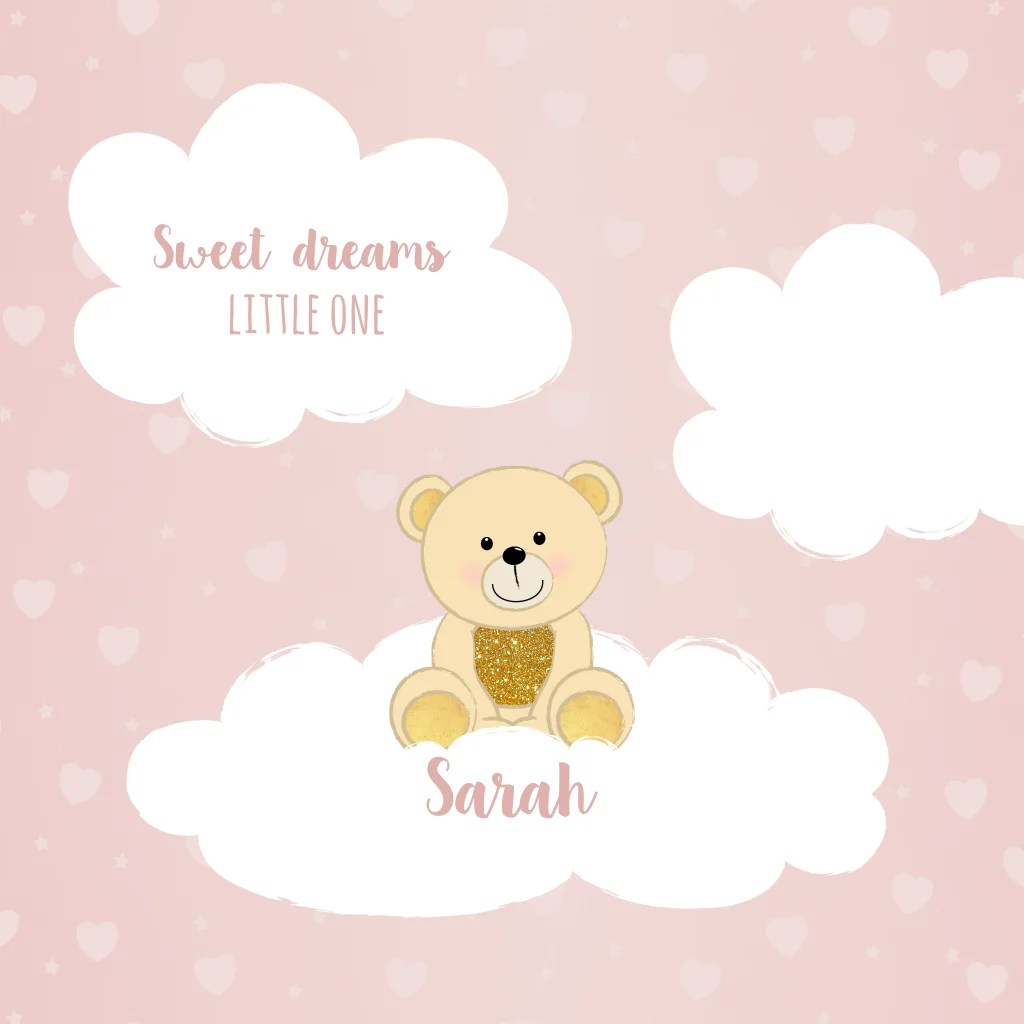 Schattige, roze geboorteposter met hartjes, sterren en wolken met een illustratie van een lief beertje. Sweet dreams, little one. De teksten op deze super lieve poster zijn gemakkelijk aan te passen. Erg leuk voor in de kinderkamer!