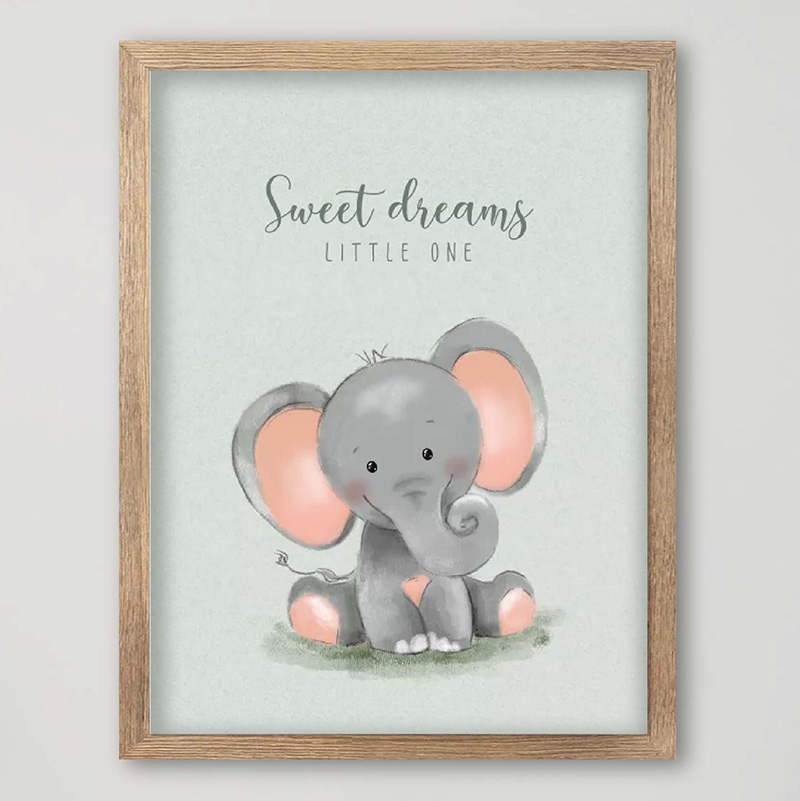 Breng een vleugje tederheid in de babykamer met deze lieve poster van een baby olifantje. De zachte lichtgroene achtergrond met subtiele structuur zorgt voor een rustige uitstraling, perfect voor boven het wiegje. De tekst “Sweet dreams little one” kun je eenvoudig aanpassen of vervangen door een naam of eigen boodschap, zodat het helemaal past bij jouw stijl en wensen.