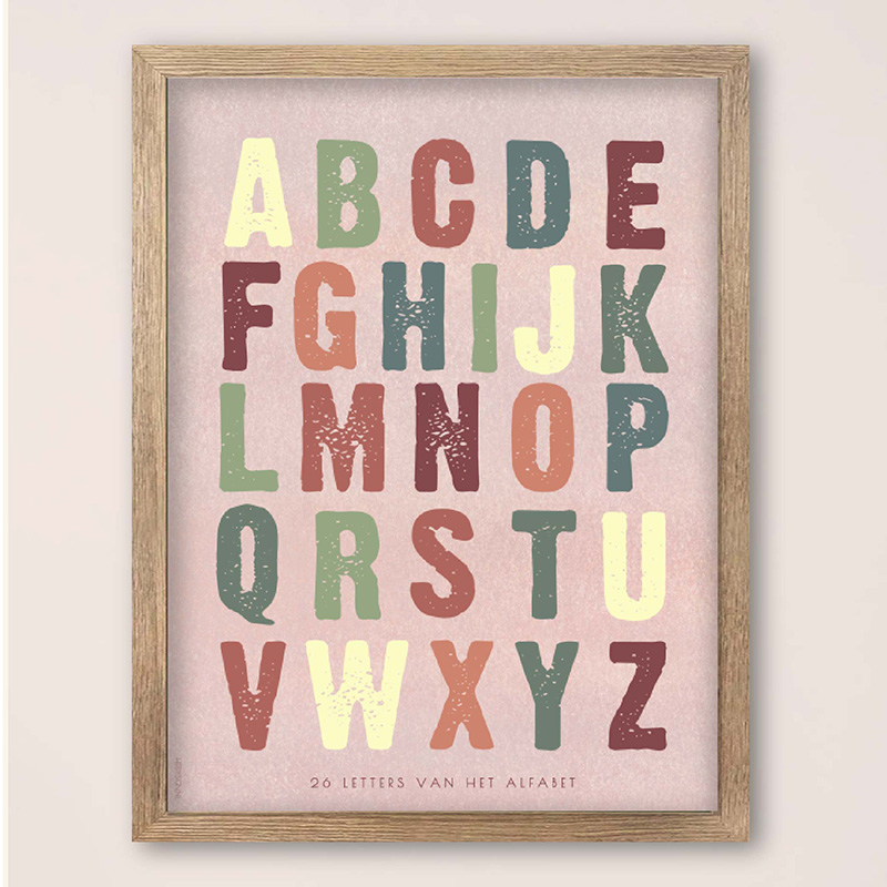 De poster heeft een opvallende oranje-roze achtergrond met een subtiel structuurtje, wat het een speels en sfeervol karakter geeft. Op de poster zijn alle letters van het alfabet te vinden, elk in verschillende kleuren. Het alfabet vormt de bouwstenen van taal en creativiteit.