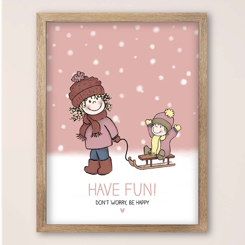 De tekst “Have fun! Don’t worry, be happy” geeft deze poster een positieve boodschap – ideaal voor in de kinderkamer, speelkamer of als vrolijke winterdecoratie in huis.