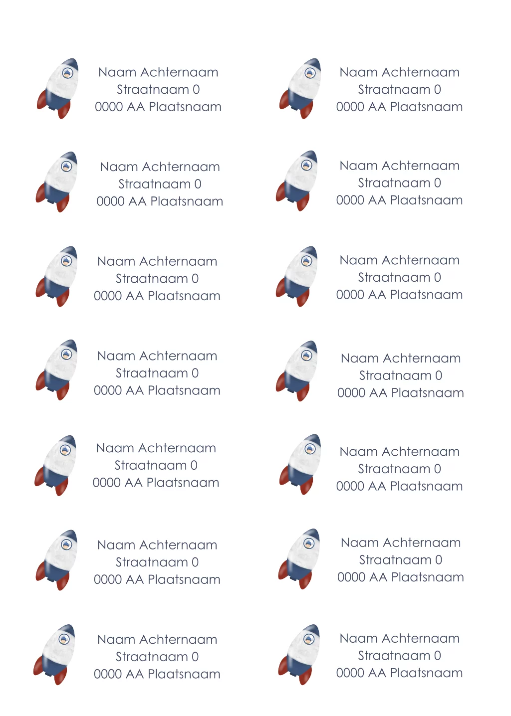 Maak jullie geboortepost extra bijzonder met deze leuke adresstickers met een tekening van een schattige raket uit onze collectie. Elke set bevat 14 stickers per vel, en de voorbeeldadressen kunnen eenvoudig worden aangepast naar jullie eigen gegevens.