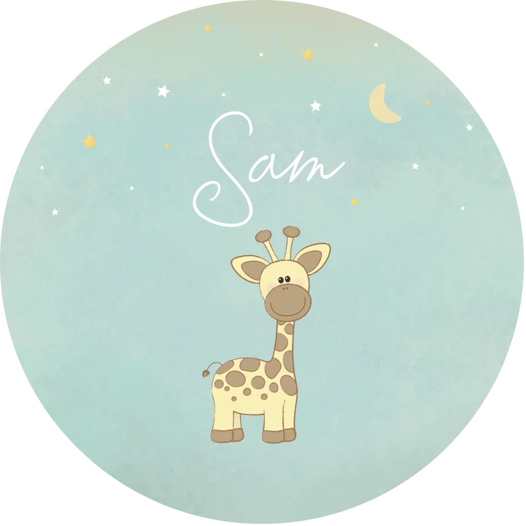 Hippe aanvulling voor in de babykamer. Deze mooie behangcirkel heeft een blauw groen gekleurde velvetlook en een illustratie van een schattig girafje, sterretjes en een maantje.