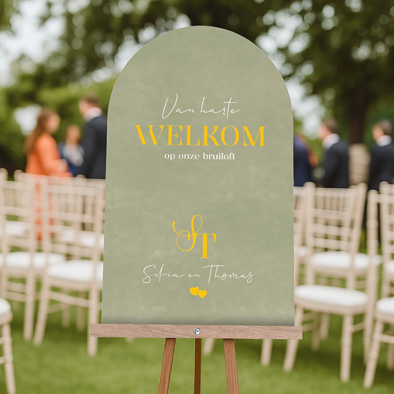 Geef jullie gasten een warm welkom met dit stijlvolle trouwbord in boogvorm. Het bord heeft een zachte olijfgroene achtergrond en zonnige gele accenten in een klassieke en romantische stijl. Met jullie namen, initialen en een persoonlijke boodschap wordt dit bord een prachtige aanvulling op jullie trouwdag.