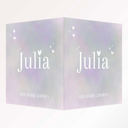 Met dit hippe geboortebord laat je iedereen weten dat jullie kindje is geboren! Dit raambord heeft een trendy paarse holografische achtergrond met de babynaam groot weergegeven, omringd door hartjes en vlindertjes.