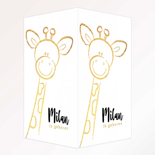 Met dit unieke geboortebord laat je iedereen weten dat jullie kindje is geboren! Dit raambord heeft een elegante lijntekening van een speels en vrolijk girafje in goudtinten.