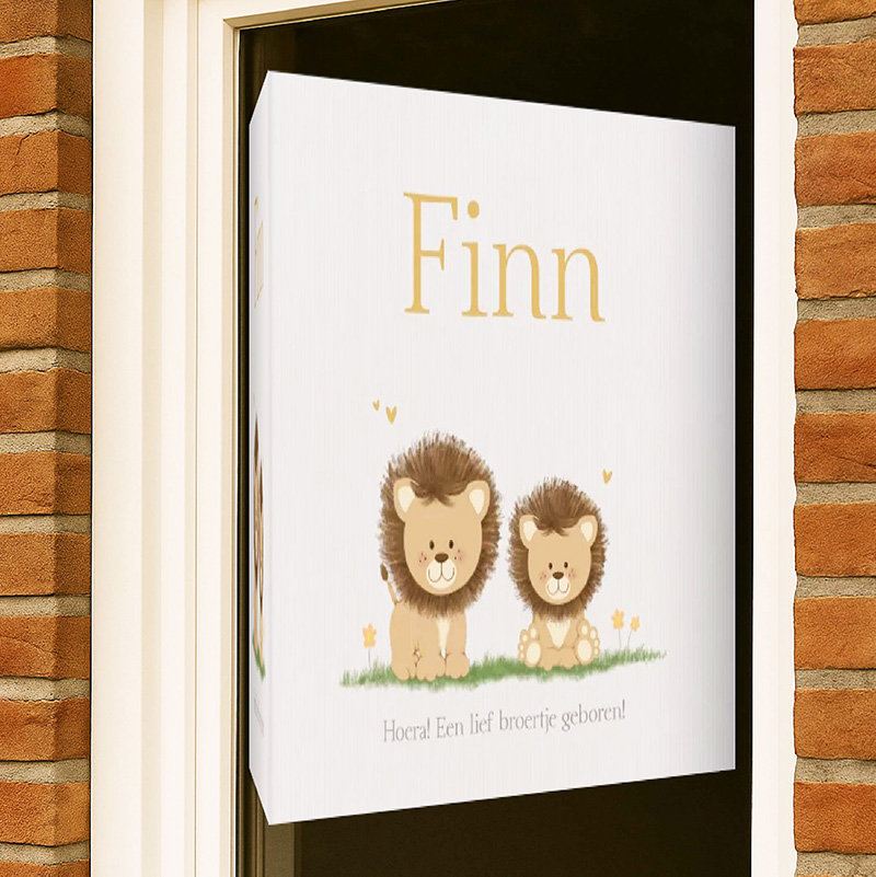 Laat iedereen weten dat jullie kindje er is met dit lieve geboortebord voor op het raam. Het ontwerp toont twee schattige leeuwtjes in warme natuurtinten – perfect voor een broertje of jongste telg in het gezin.