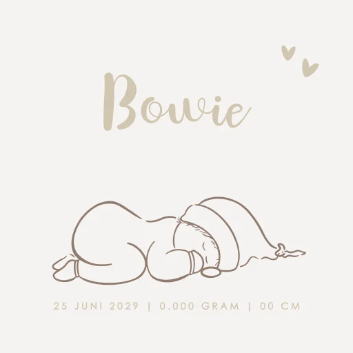 Naturel geboortetegeltje, waarop een elegante lijntekening van een slapend kindje is afgebeeld. De tegel heeft een zachte, lichte achtergrondkleur en een donkere lijntekening in een warme grijsbruine tint. De naam, geboortegegevens en twee kleine hartjes zijn in een lichtere tint aangebracht voor een subtiele en verfijnde uitstraling. Dit tegeltje kun je naar wens aanpassen en is een zo een uniek, minimalistisch aandenken en een uniek cadeau voor de geboorte van je kleintje.