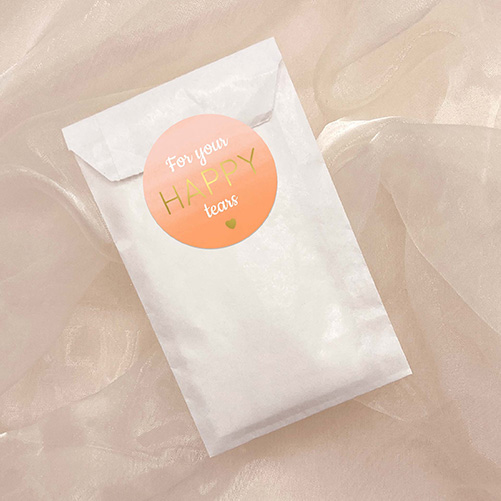 Voeg een persoonlijke en emotionele touch toe aan jullie bruiloft met de "Happy Tears Sticker" uit de Golden Peach trouwcollectie. Deze elegante sticker, in zachte perziktinten met luxe goudfolie, is perfect voor het versieren van licht doorschijnende zakjes waarin zakdoekjes voor jullie gasten kunnen worden geplaatst. Ideaal voor het creëren van een stijlvolle en harmonieuze sfeer op een lente- of zomerbruiloft. Bestel de bruiloftszakjes eenvoudig samen met de stickers en voeg zelf een zakdoekje toe. Ontdek de volledige Golden Peach collectie en geef jullie trouwdetails een romantisch en verfijnd accent. Let op: de sticker heeft een diameter van 35mm, dus kleine details en tekst kunnen moeilijk leesbaar zijn.