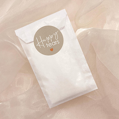 Voeg een vleugje emotie toe aan jullie bruiloft met onze "Happy Tears Sticker" met kraft look. Speciaal ontworpen voor gebruik op een elegant, licht doorschijnend zakje waarin zakdoekje geplaatst kan worden voor jullie gasten. Bestel de zakjes eenvoudig bij de stickers voor een volledig gepersonaliseerde ervaring.