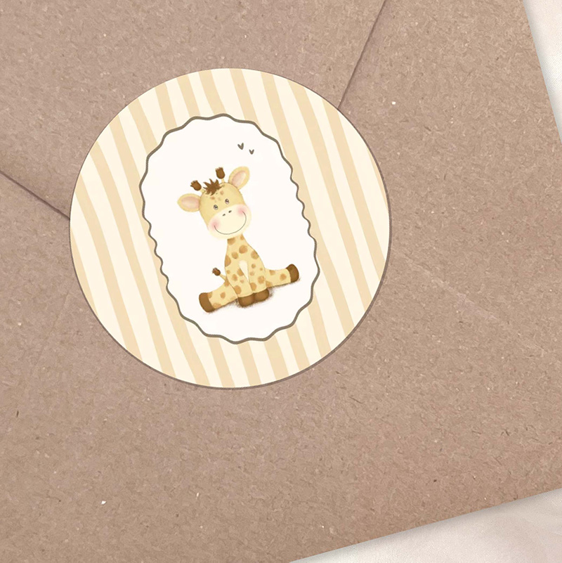 Verzend je geboortekaartjes in stijl deze bijpassende sluitzegel! Of gebruik ze voor op een geboortebedankje. De speelse strepen in honingbeige en romig ivoor, gecombineerd met het schattige girafje, geven een warme en vrolijke uitstraling. Perfect om enveloppen, cadeautjes of traktaties een extra liefdevolle touch te geven.