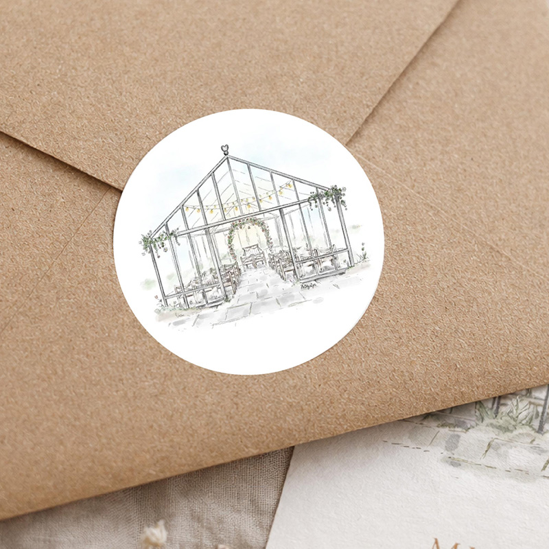 Sluitzegel met een verfijnde illustratie van een kas als trouwlocatie. De fijne lijnen en zachte kleuren geven deze sticker een rustige en romantische uitstraling, perfect passend bij een kas- of buitenbruiloft.
