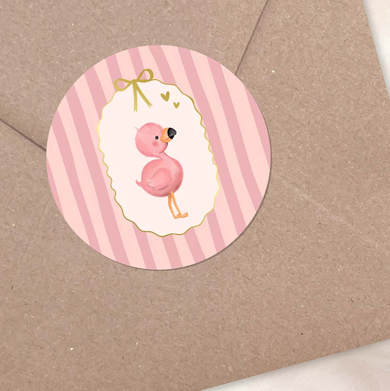 Verzend je geboortepost in stijl met deze elegante sluitzegel! De zachte koraalroze strepen, gecombineerd met de sierlijke flamingo en warme tinten, geven een chique en speelse uitstraling. Perfect om enveloppen, bedankjes of cadeautjes net dat beetje extra te geven.