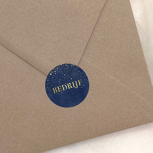 Verzend in stijl met onze sluitzegel op de envelop, perfect afgestemd op je zakelijke kerstkaart. Deze elegant vormgegeven sluitzegel in diep donkerblauw is versierd met schitterende goudfolie sterren, die een luxe uitstraling geven. De naam van jouw bedrijf is gedrukt in glanzende goudfolie, waardoor je enveloppen een professionele en feestelijke touch krijgen. Ideaal voor het versterken van je merkidentiteit terwijl je kerstgroeten verstuurt.