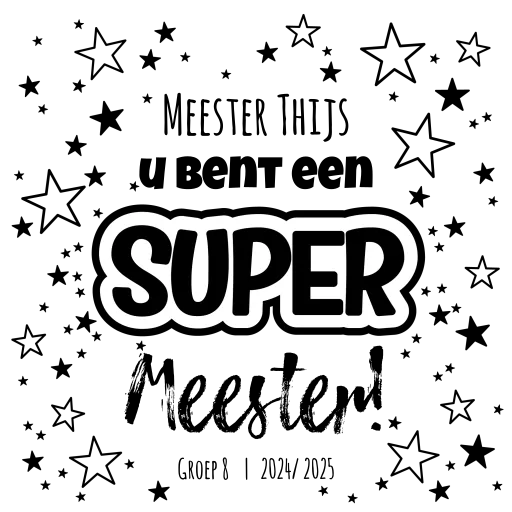 Voor de meester die een echte SUPERheld is! Dit zwart-witte tegeltje staat vol sterren en krachtige typografie. De tekst "U bent een SUPER meester!" springt eruit. Een stoer ontwerp dat gegarandeerd een glimlach oplevert — leuk om samen met de klas te geven als bedankje. Plaat de naam van de meester op het tegeltje en onderaan jouw naam of klasnaam en maak er een uniek en persoonlijk afscheidscadeautje van.