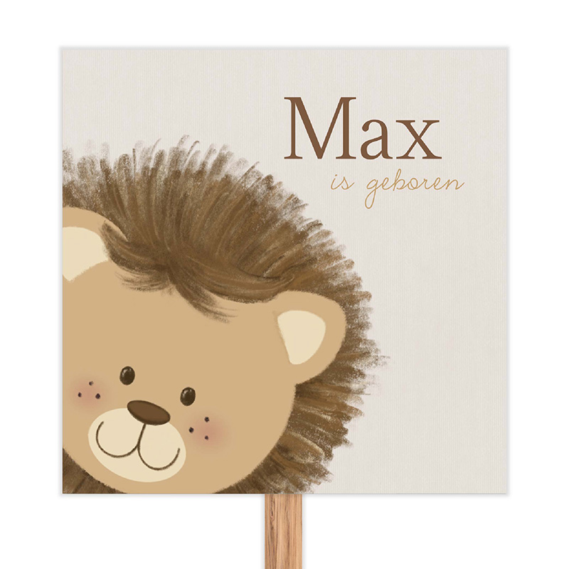 Laat iedereen weten dat jullie kleintje is geboren met dit vrolijke geboorte tuinbord met leeuwtje. Het lieve en stoere leeuwtje steelt de show op dit bord met een zachte crème achtergrond en warme bruintinten. De naam van jullie kindje en de tekst “is geboren” maken het ontwerp helemaal af.
