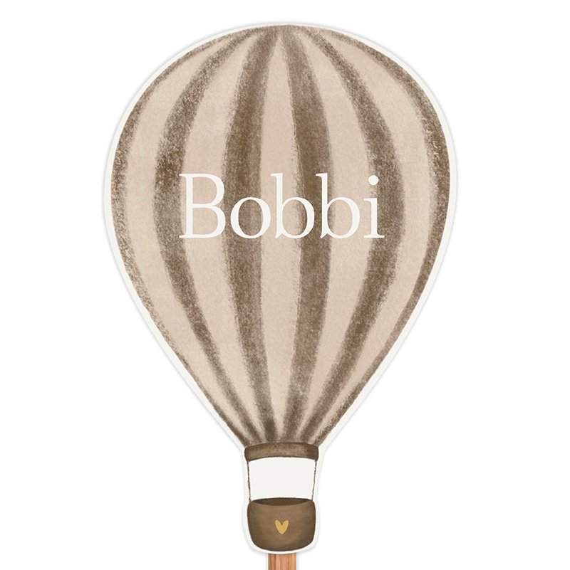 Dit geboorte tuinbord in de vorm van een luchtballon is een lieve en unieke manier om de geboorte van jullie kindje aan te kondigen. De zachte beige tinten en rustige strepen geven het ontwerp een warme, tijdloze uitstraling, terwijl de ballon zorgt voor een speels en bijzonder effect in de tuin.
