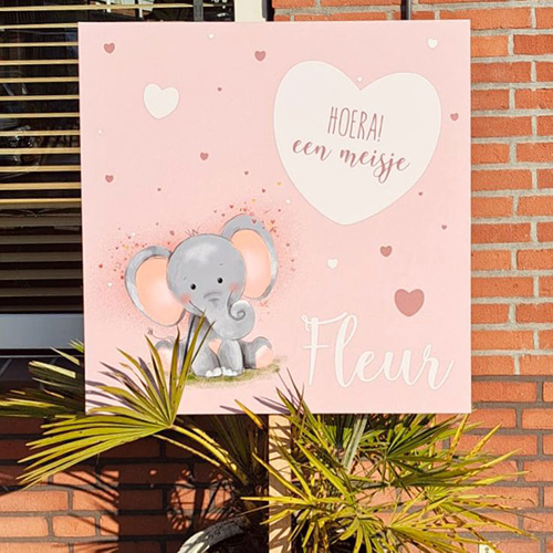 Geboortebord meisje voor in de tuin met schattig babyolifantje