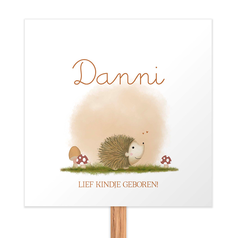Een prikkel van geluk! Dit vierkante tuinbord met een schattig egeltje is een vrolijke en lieve manier om de geboorte van jullie kindje aan te kondigen. Het ontwerp sluit perfect aan bij het geboortekaartje Danni, met zachte aquarelkleuren, paddenstoeltjes en een knus herfstthema.