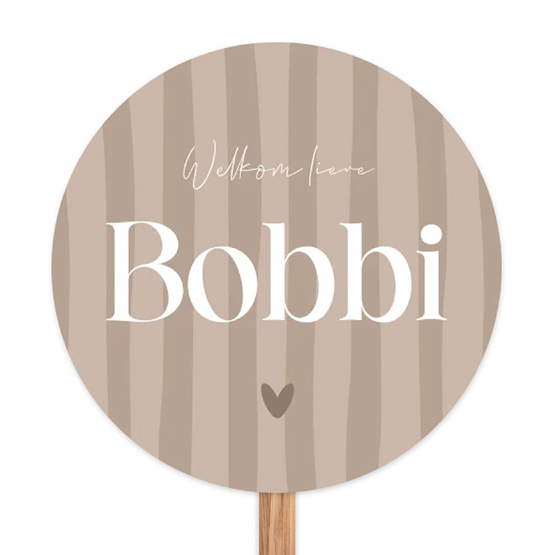 Welkom lief kindje! Dit stijlvolle ronde tuinbord in warme beige tinten is perfect om de geboorte van jullie baby te vieren. De speelse strepen en het lieve hartje zorgen voor een zachte, rustige uitstraling. De naam Bobbi staat centraal en springt er prachtig uit in het witte lettertype.