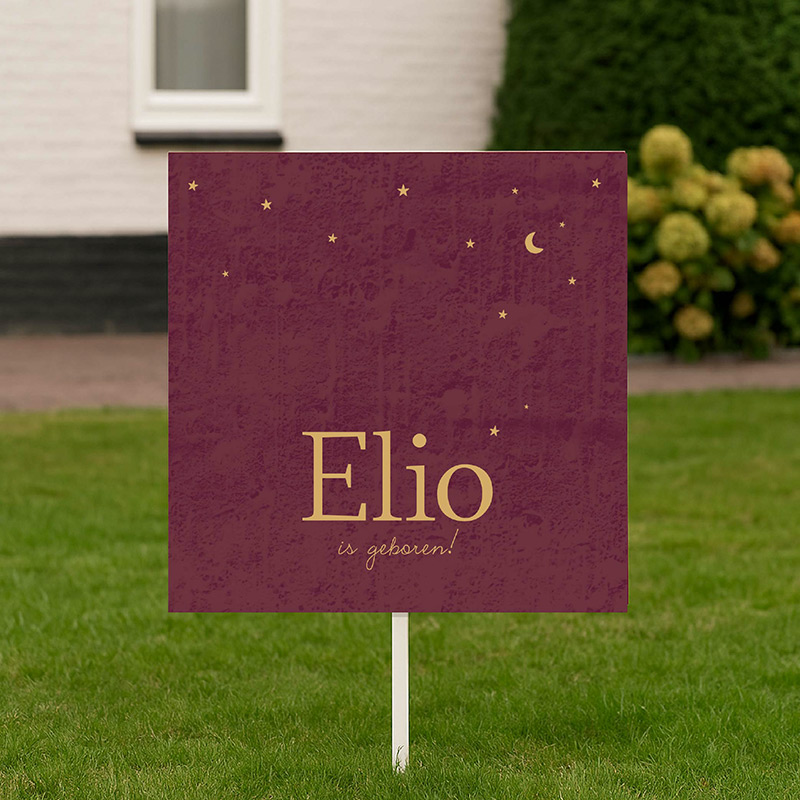 Vier de geboorte van jullie kindje met dit stijlvolle tuinbord in diepe bordeauxkleur. De naam Elio staat groot en trots in het midden, omringd door een maan en gouden sterretjes. De rustige achtergrondstructuur en warme tinten geven dit bord een chique uitstraling – perfect voor wie houdt van een minimalistische, maar opvallende aankondiging.