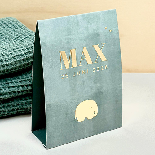 Maak de aankondiging van jullie zoontje extra speciaal met dit prachtige en stoere geboortekaartje in de vorm van een tent. Het groene ontwerp met een stoere structuur straalt minimalistische klasse uit. Het olifantje en de naam worden gedrukt met goudfolie, waardoor het kaartje een unieke en verfijnde uitstraling krijgt. Personaliseer het kaartje naar wens voor een extra persoonlijk tintje. Ontdek de charme van dit ontwerp door een proefdruk te bestellen. En, praktisch detail: het kaartje is eenvoudig in elkaar te vouwen, zonder lijm.