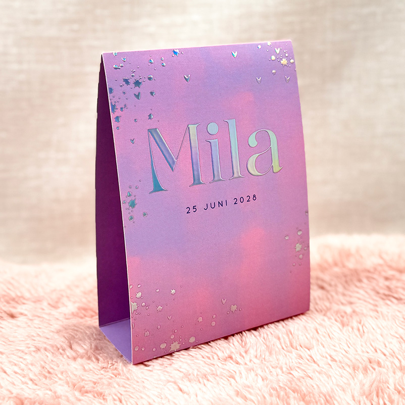 Geef de geboorte van jullie dochter een stoere touch met ons betoverende geboortekaartje in de vorm van een tent. Het opvallende ontwerp in stoere roze en lila tinten wordt versterkt door een schitterende holografische foliedruk. Personaliseer het kaartje naar wens. en bestel een proefdruk om de kaart in het echt te bewonderen. En, handig detail: het kaartje is eenvoudig in elkaar te vouwen, zonder lijm.