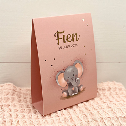 Tent geboortekaartje meisje oudroze met olifantje en goudfolie
