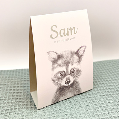Vier de komst van jullie kleintje met ons unieke geboortekaartje in de vorm van een tent, met een potloodtekening van een lief wasbeertje. In zachte grijze tinten, is dit kaartje ideaal voor een jongen. Personaliseer het kaartje volledig naar eigen smaak, inclusief de toevoeging van de babynaam en geboortegegevens. Bestel een proefdruk om de bijzondere details van dit ontwerp te ervaren. De kaart is bovendien eenvoudig in elkaar te vouwen, zonder lijm.